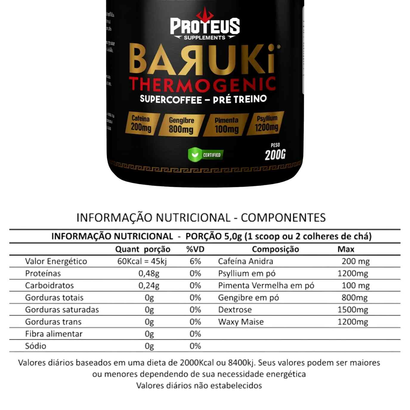 4- Baruki Thermogenic Supercoffee Pré-Treino: Cafeína Anidra, Psyllium, Gengibre, Pimenta vermelha, dextrose.