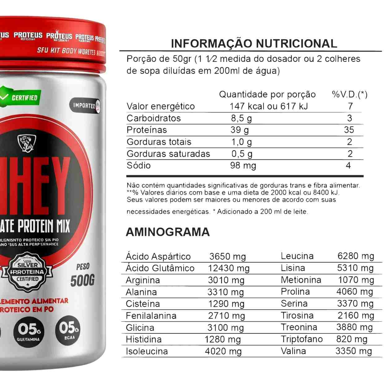 1- Whey Protein: Whey Protein Isolado (WPI), Whey Protein Concentrado (WPC), Soy Protein, Glutamina, Bcaa, Albumina, Dextrose, Sucralose, Sabor.
