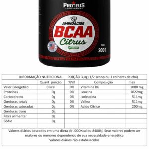3- Bcaa Citrus Aminoácidos Essenciais: Vitamina B6, Leucina, Isoleucina, Valina e Ácido Cítrico.